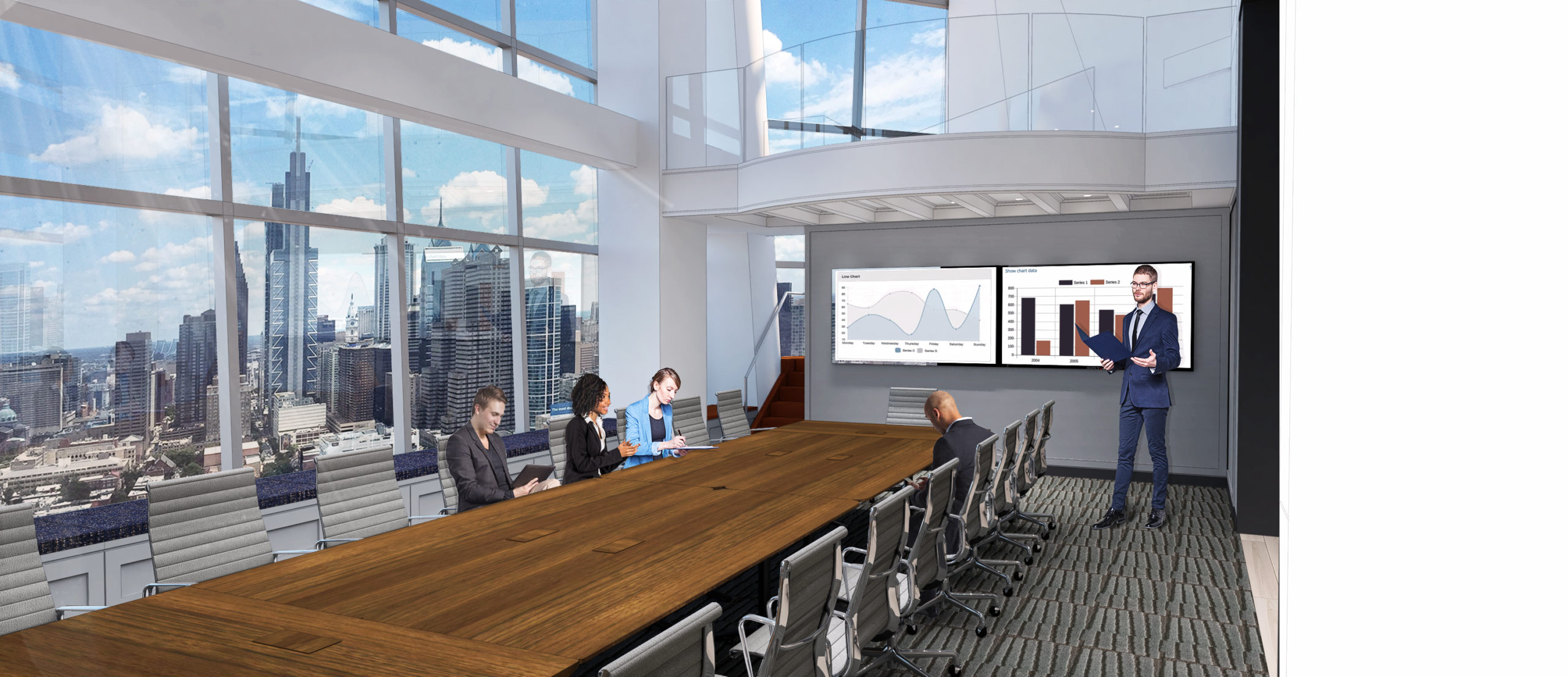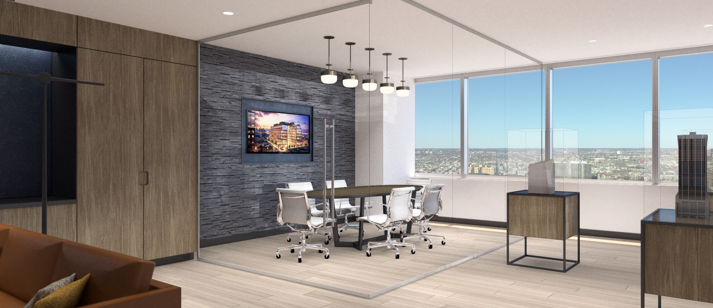 This project allowed Tantillo Architecture to revisit and earlier project of ours completed fifteen years before to refresh/reconfigure the interior office environment of the top two floors with an eye towards current work-life trends. The private equity real estate client sought to create an open office space with all glass office fronts to maximize vistas to the city skyline beyond with a variety of collaborative meeting areas. To highlight the nature of their real estate business, the lobby became an interactive marketing area utilizing video monitors, virtual reality goggles, and physical models.