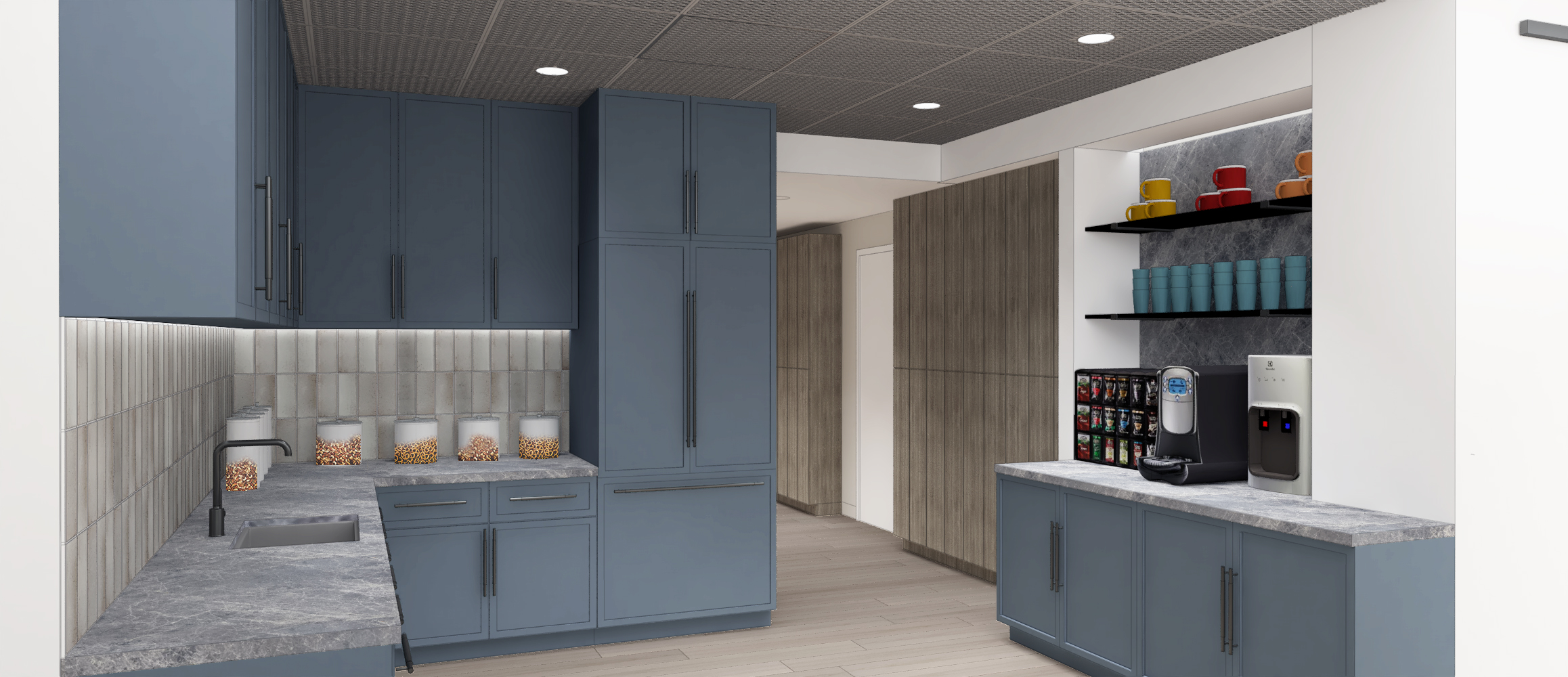 As a company that invests substantially in real estate markets around the country, Tantillo Architecture chose to emphasize architectural materiality in the project to convey quality and value. With this strategy in mind, Tantillo Architecture collaborated with local fabricator Amuneal in designing a custom faceted steel feature wall in the reception area that sets the stage for richness of materials utilized in the project. Hundreds of angled sheet metal modules were CNC-formed and a custom mounting method was employed to create a unique wall texture, floor to ceiling. The top floor was converted into a true amenity floor with fitness, game room, expanded kitchen and various meeting rooms to provide for flexible configurations for staff and events.